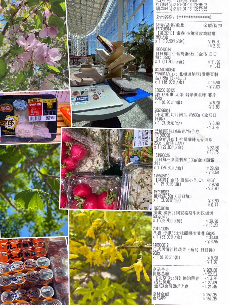每周二是超市购物日,今天的超市购物也是心情起伏的一部分,比如槐花、金盏花、小萝卜被放在一起非常美丽,第一次买到免洗免切的鸡腿排可以做农协鸡腿,雪梨小苦瓜汁的甜与苦平衡感非常奇妙,迷你包装的纳豆非常可爱。每次会员日的优惠也能带来少量的正向心情起伏。