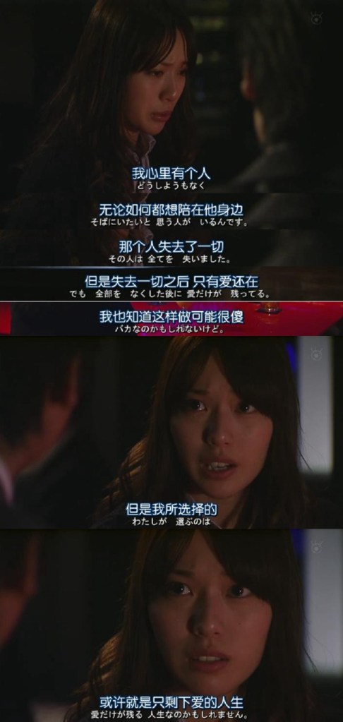 《追忆潸然》,包括坂元裕二的其他作品,比起《大切》都更饱含“摩擦力”,因此无法轻易地归纳概括。爱既包括,即使相爱,也理解对方为何不能和自己在一起,并且知道对方也会理解(木穗子追问音为何不和练在一起时,音的答复)。也包括,哪怕有重重阻隔,也相信只要有路,再加上一点点运气,无论如何也想见你(结局处,练跑到北海道对音表达的)。基本上,只要爱着对方,其实本质都是希望对方能够得到他所应得的,哪怕那个东西与自己的利益相悖(木穗子、小夏都喜欢着练,但也希望他和音在一起)。
